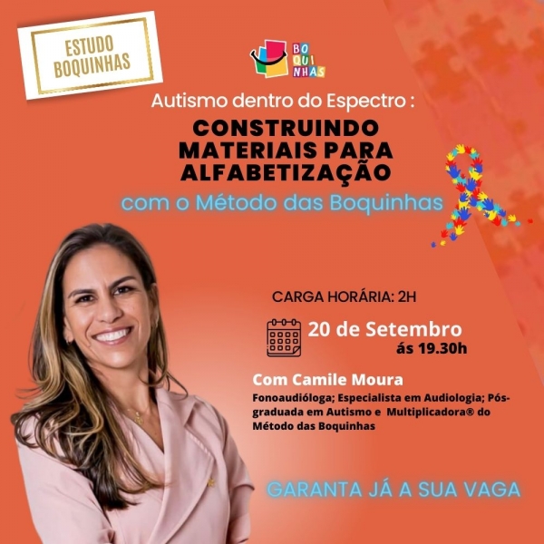 Mais um Estudo de Boquinhas que ocorreu no dia 20/09/2023 as 19,30h com a ministrante Camille Moura Palma abordando o tema "Autismo dentro do Espectro: Construindo materiais para alfabetização com o Método das Boquinhas ". Foram 2 horas de Estudo com Certificado e acesso a gravação por 3 meses na plataforma de Curso Boquinhas.