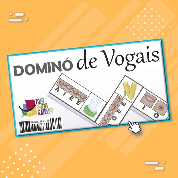 Nesse jogo Dominó de Vogais, elaborado pela autora Dra. Renata Jardini, trabalha-se o domínio visual de figuras, associado à sequência de vogais (letras) e articulações (boquinhas) das palavras dessas figuras. Esse é um trabalho de consciência fonológica e fonêmica (som individual), primordial para a alfabetização.