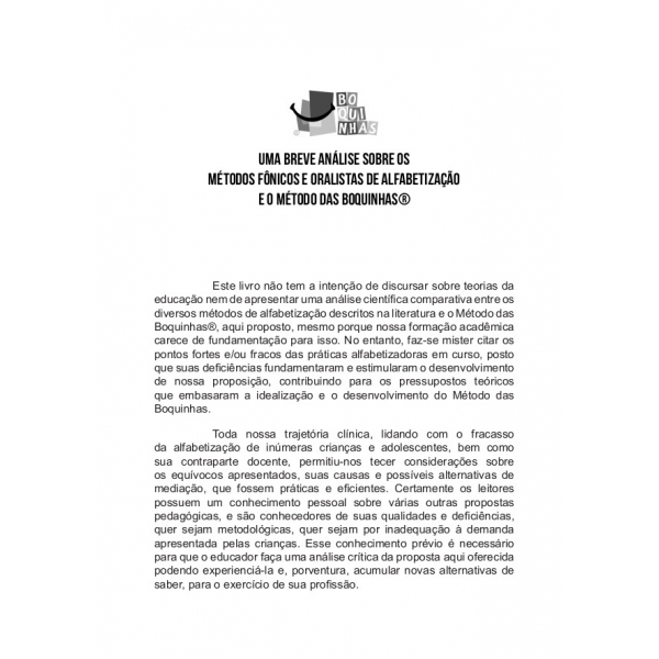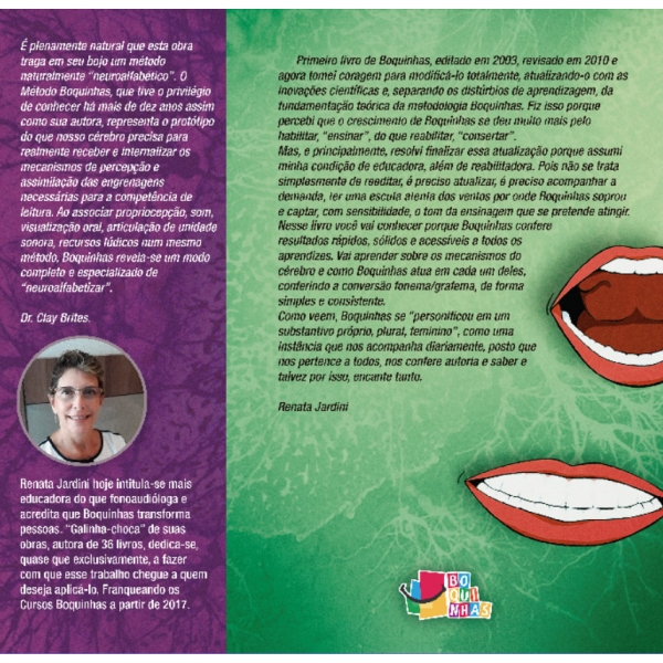 Assim, é plenamente natural que esta obra traga em seu bojo um método naturalmente “neuroalfabético”. O Método Boquinhas, que tive o privilégio de conhecer há mais de dez anos assim como sua autora, representa o protótipo do que nosso cérebro precisa para realmente receber e internalizar os mecanismos de percepção e assimilação das engrenagens necessárias para a competência de leitura. Ao associar propriocepção, som, visualização oral, articulação de unidade sonora, recursos lúdicos num mesmo método, Boquinhas revela-se um modo completo e especializado de “neuroalfabetizar”.