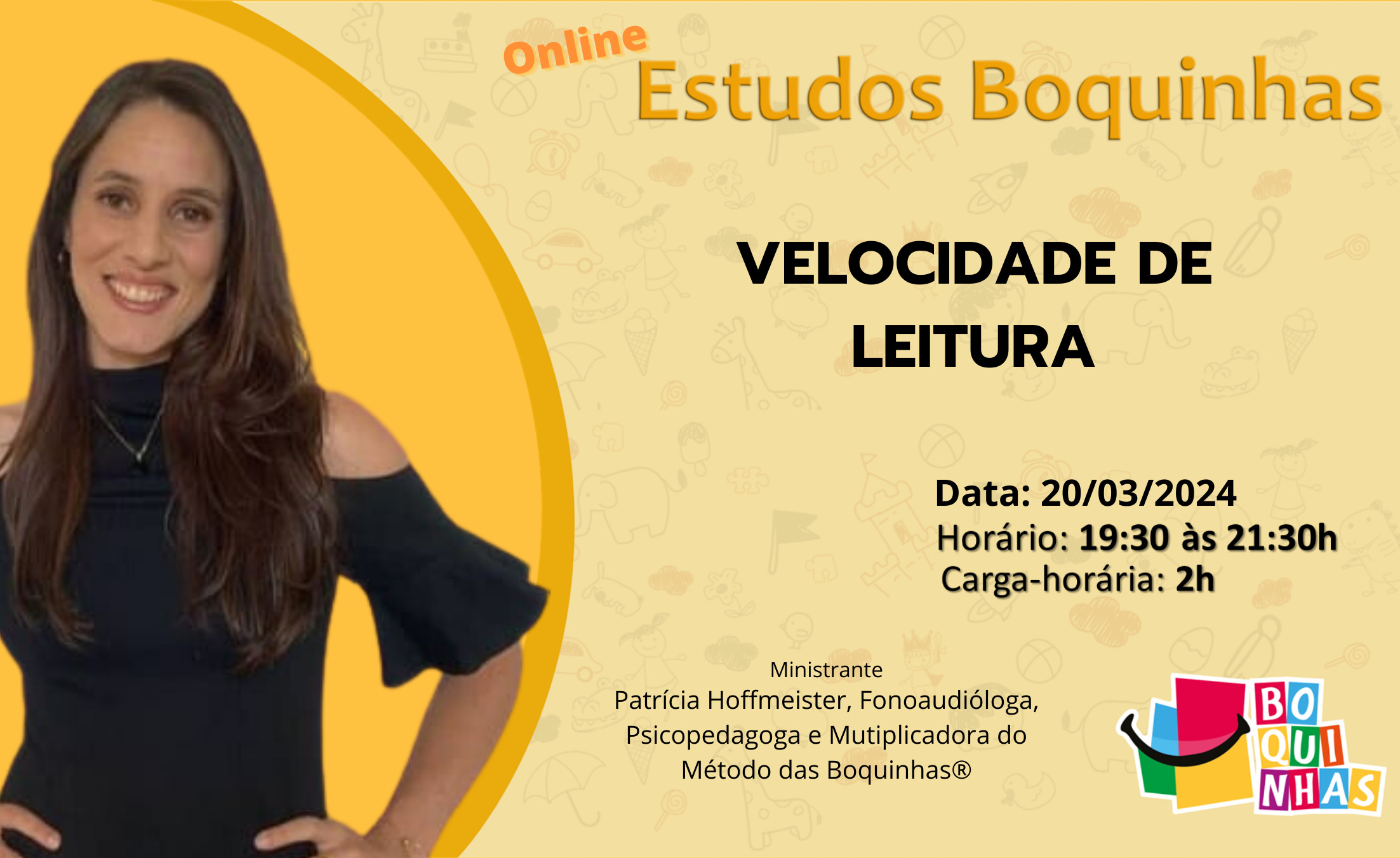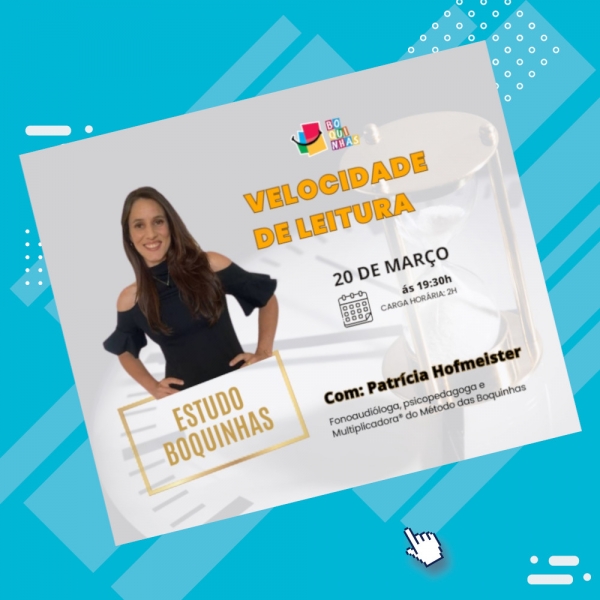 Mais um Estudo de Boquinhas que ocorreu no dia 20/03/2024 as 19,30h com a ministrante Multiplicadora Patricia Hoffmeister abordando o tema "Velocidade de Leitura”. Foram 2 horas de Estudo com Certificado com acesso a gravação por 3 meses na plataforma de Curso Boquinhas.